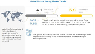 The Global Aircraft Seating Market is projected to grow from USD 4.1 billion in 2020 to USD 5.8 billion by 2026, at a CAGR of 5.8% from 2020 to 2026, by Class, Type, End Use, Aircraft Type, Materials, Components, and Region. The market is driven by various factors, such as the growing demand for seats installed with IFEC systems, increasing number of premium economy seats, and maintenance & retrofitting of existing aircraft.
